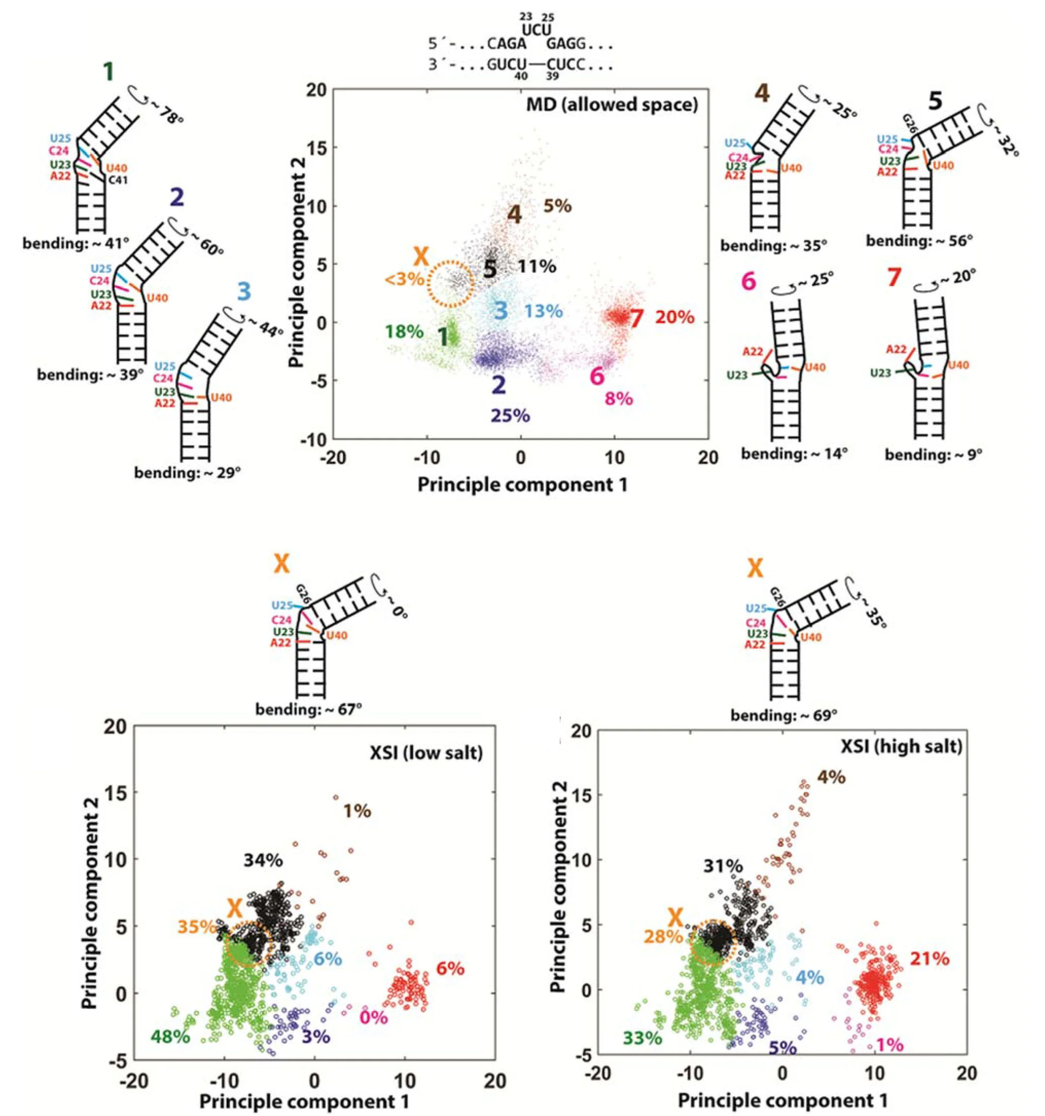 Understanding the ensemble of conformational states adopted by proteins and structured nucleic acids has been a long standing goal of biophysics. At the level of tertiary and quaternary structure, ensembles consist of domain motions and mechanical deformations of a macromolecule. This kind of conformational change is often linked to biological function, for example the structural rearrangements of the ribosome during translation initiation. Determining the three‑dimensional structure of ensembles has been extremely challenging, because the ensembles are heterogeneous and involve nanometer‑scale movements. To address this problem, our lab developed an approach for measuring precise intra-molecular distance distributions in aqueous solution, matching the spatial accuracy of X-ray crystallography. We have used this tool to quantify the microscopic elastic properties of DNA and to determine the three‑dimensional ensemble structure of several ubiquitous nucleic acid motifs, including DNA bulges, RNA kink turns and the TAR RNA (collaboration with the lab of Dan Herschlag). Importantly, we are using the data to develop, test and critique molecular dynamics simulations and coarse‑grained computational models. Ongoing work addresses the geometry and mechanical stiffness of engineered nucleic‑acid nanostructures, and accurate protein structure determination in solution from small‑angle x‑ray scattering measurements.